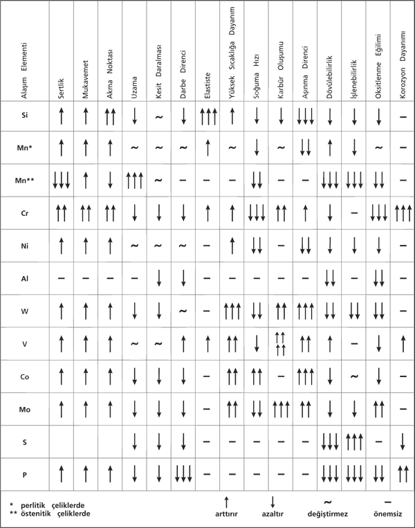| Özellik | Si | Mn* | Mn** | Cr | Ni* | Ni** | Al | W | V | Co | Mo | S | P |